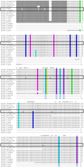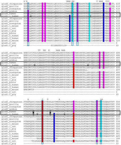As for differences in the mature proteins, several modifications have been found in mammals, which only apply to hGDH1. These modifications include phosphorylation of Ser227, which is substituted with Asn227 in GDH2 isoenzyme and therefore cannot be phosphorylated. Ser/Asn227 is localized in the NAD(P)H substrate binding site of GDH1 or GDH2, correspondingly (Figure 2). Such substitution obviously results in different phosphorylation of the GDH isoenzymes. Among other differences, highlighted in Figure 2, are substitutions in Ser384 in the NAD(P)H substrate binding site to Thr384 in most of GDH2s with the exception of the gibbon GDH2, where a Ser residue is present. Among apes (Figure 2), the chimpanzee, orangutan and gorilla GDH sequences are more closely related to human GDH sequences than to the gibbon sequences. Hence, the substitution of Ser384 to Thr in GDH2 sequences illustrates evolution of this enzyme in the hominoid taxonomic clade. Whether Ser384/Thr substitution is accompanied by altered regulation via phosphorylation is, however, unclear.