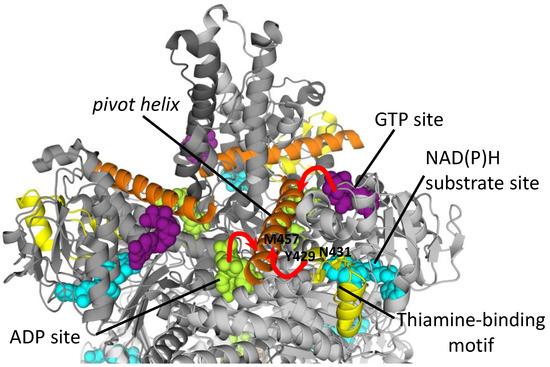 Due to the known interactions between the three nucleotide-binding sites of GDH (catalytic for NAD(P)H, activation for ADP and inhibition for GTP), kinetic determination of potential binding of the thiamine compounds to any of these GDH nucleotide binding sites does not seem feasible. As an alternative approach for localization of the binding site for thiamine compounds, the existence of the thiamine-binding sequence motifs in GDH was investigated [116]. After the thiamine-binding motifs were identified within the protein sequences, the 3D conformations of these motifs were assessed for similarity to their original 3D conformations in the thiamine-dependent protein templates [116]. One such motif with appropriate 3D conformation (Figure 5, shown in yellow) was found in close proximity to the glutamate- and NAD(P)H-binding sites (4.48 Å and 3.25 Å, respectively) [116]. The thiamine-binding motif is located at the edge of the typical βαβ-fold of NAD+-binding domain, proximal to several α-helices, including the pivot helix (Figure 5, orange). The N-terminal end of the pivot helix is involved in binding of GTP and ADP in one subunit, whereas its C-terminal end is close to the ADP-binding site of another subunit (Figure 5, indicated by red arrows). Therefore, localization of the thiamine-binding motif next to the C-terminus of the pivot helix suggests interaction of the thiamine site with both allosteric nucleotide-binding sites through the pivot helix (Figure 5, indicated by a red arrow). The interaction of the thiamine-binding motif (Figure 5, yellow) with the pivot helix (Figure 5, orange) is mediated by the hydrogen bond between the hydroxyl group of Tyr429 residue of the thiamine motif, and O-atom of Met514 of the pivot helix (in the mature GDH protein (3JD4) these residues are Tyr372 and Met457). Binding of the thiamine compounds by the motif may also regulate NAD(P)H binding in the substrate site, because another residue of the thiamine-binding motif, Asn431 (Asn374 in the GDH 3D structure 3JD4), is involved in the NAD(P)H binding at the substrate site [116]. The kinetic data shows that ThDP binding to GDH affects both the ADP-dependent activation of GDH and the substrate NADH binding. This supports the hypothesis that ThDP binds through the GDH thiamine-binding motif which interacts with both the ADP and substrate NADH sites through Tyr429 and Asn431, respectively.