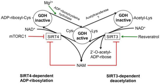 Schematic representation of GDH post-translational modifications regulated by sirtuins 3 and 4. ADP-ribosylation and acetylation are shown on the left and right, respectively. NAD+-dependent ADP-ribosylation of GDH is catalyzed by sirtuin 4 (SIRT4). Nicotinamide (NAM) is the second reaction product. As a result of the modification of a cysteine residue, GDH loses its catalytic activity. GDH deribosylation is catalyzed by ADP-ribosylcysteine hydrolase, which requires magnesium ion as a cofactor (indicated by a green arrow). The enzyme catalyzing acetyl-CoA-dependent GDH acetylation has not been identified, which is depicted as “Acetyltransferase ?”. GDH deacetylation is catalyzed by NAD+-dependent mitochondrial deacetylase, sirtuin 3 (SIRT3). NAD+ and acetylated GDH are the substrates for SIRT3 in the reaction releasing 2′-O-acetyl-ADP-ribose, NAM and deacylated GDH. The product of the sirtuin-dependent reactions, NAM, inhibits sirtuins. SIRT4 activity can be repressed via mTORC1 [122], and SIRT3 is up-regulated by resveratrol [123]. Red arrows indicate inhibition, whereas the green arrows represent activation.
