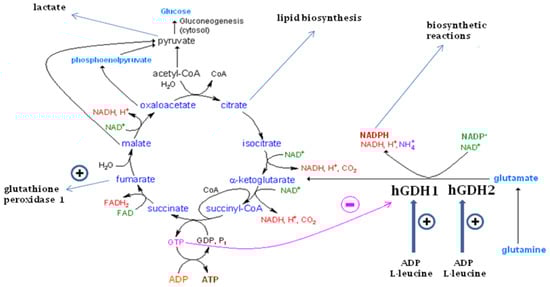 The glutamate dehydrogenase (GDH) pathway and the Krebs cycle function. As shown here, oxidative deamination of glutamate by hGDH1 and hGDH2 generates α-ketoglutarate, ammonia and NADH or NADPH. While α-ketoglutarate is metabolized by the Krebs cycle, NADPH can be used for biosynthetic reactions. GTP generated at the step of succinyl-CoA to succinate potently inhibits hGDH1 thus preventing glutamate from fueling this cycle under an adequate energy charge. On the other hand, hGDH2 has dissociated its function from GTP control and as such it permits glutamate flux under conditions inhibitory to hGDH1. Both enzymes are activated by ADP and L-leucine, which can act synergistically. Oxidative metabolism of α-ketoglutarate via the Krebs cycle generates citrate that can support the biosynthesis of lipids required for nerve tissue development and/or glioma cell growth. Also, it can generate lactate to be provided by astrocytes to neurons or by Sertoli cells to spermatids. Fumarate, generated by this pathway, is shown to stimulate glutathione peroxidase 1 activity, thus contributing to homeostasis against oxidative stress This Figure is modified from [7].