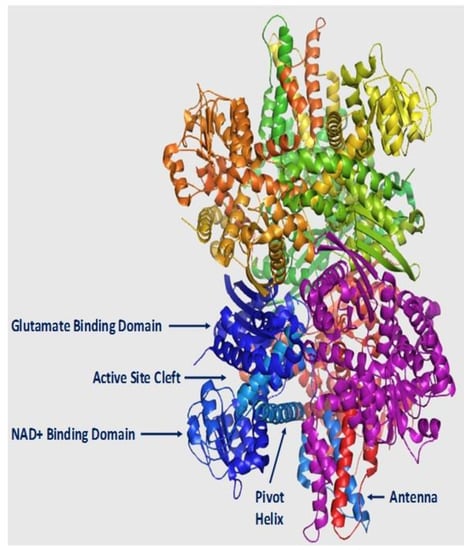At the structural level, GDH is a hexamer comprised of six identical subunits. Each of these polypeptides consists about 500 amino acids (molecular mass: ~56 kDa) [4,30]. The enzyme is composed of two trimers, with each trimer encompassing three main functional domains: the NAD+ binding, the glutamate binding and the regulatory domain (Figure 2). The regulatory domain includes the pivot helix and the “antenna”. The latter is a 48 amino acid segment that consists of an ascending α-helix, a random coil and a small C-terminal α-helix that shows striking conformational changes on opening and closure of the active site of the enzyme [18,19]. In the functional trimer, the antennas of the adjacent subunits are intertwined with this inter-subunit interaction thought to mediate allostery, but the precise mechanisms involved are not fully understood [21].