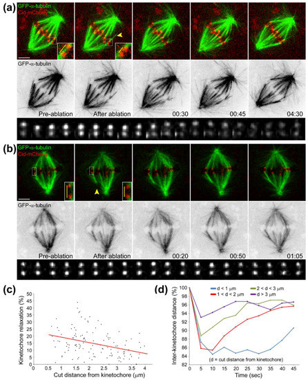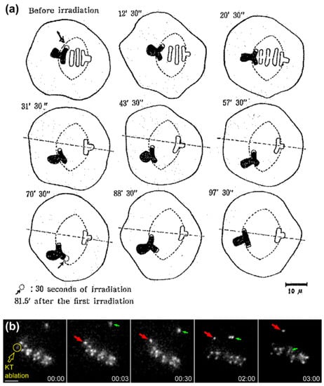 Direct evidence that the equatorial position of (already aligned) chromosomes is determined by antagonistic pulling forces on opposing kinetochores was provided by the works of Izutsu and colleagues. They irradiated one kinetochore region of a grasshopper bivalent chromosome in metaphase I using a focused UV microbeam, resulting in the gradual motion of the irradiated bivalent towards the spindle pole facing the non-irradiated kinetochore [20,21,22] (Figure 2a). Similar findings were subsequently reported by McNeal and Berns for mitotic chromosomes in cultured PtK2 cells [23] (see Figure 2b for a representative example using Drosophila S2 cells). Hays and colleagues also estimated the force-length relationship on experimentally generated trivalents in living grasshopper spermatocytes and found it to be consistent with Östergren’s hypothesis [24]. However, ideas that the pulling force on kinetochores is not a function of k-fiber length, but rather of their diameter (as function of the number of microtubules attached) started to emerge [25], but even this view has been controversial. For instance, a balance of microtubule numbers on opposite kinetochores has been suggested by elegant experiments using laser microsurgery combined with correlative light and electron microscopy of meiosis I spermatocytes [26], but recent work that measured birefringence retardation of k-fibers of maloriented bivalents challenged this model [27]. In addition, no positive correlation between the number of kinetochore microtubules and the direction of chromosome movement could be observed in vertebrate cells [28]. Overall, these pioneering studies provided definitive demonstration that chromosome position at the equator is maintained (but not necessarily achieved) through a balance of pulling forces acting on opposite kinetochores from the same chromosome that do not strictly depend on k-fiber length or kinetochore microtubule number.