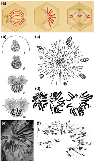 Based on their observations on transient monopolar spindles, Bajer and Mole-Bajer proposed that “The only logical explanation for the behavior of chromosomes in monopolar division is that the chromosomes approach the center of the aster only to the point at which there is equilibrium between the aster elimination property and the pulling of kinetochore fibers.” [39]. Although this “aster elimination property” or “polar ejection force (PEF)” has been noted more than a century ago by Drüner, who refers to a pressure by “growing beams” [i.e., microtubules] from the poles when they encounter an obstacle such as chromosomes [12] (Figure 3a), and was quite evident in the invaginations of the nuclear envelope as the aster develops in prophase (see [10]; Figure 3b) and found to exclude large organelles (e.g., mitochondria) from the centriolar region (reviewed in [40]; Figure 3c), it was Darlington that firmly proposed its involvement in chromosome congression (although he assumed this was essentially due to electrostatic repulsions). This view was based on the analysis of pollen-grain mitosis, in which the distance of peripheral centromeres relative to the spindle pole was highly variable [1] (Figure 3d). This irregular pattern likely reflected the dynamic behavior of chromosomes on monopolar spindles, which was subsequently extensively characterized by Bajer and colleagues [39,41,42] (Figure 3e,f). Together, these studies supported a new view of chromosome congression involving a balance of PEFs and kinetochore-pulling forces.