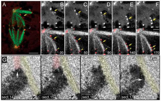 Demonstration that chromosome congression is independent of bi-orientation. From A-F, the movement of a polar chromosome along a pre-existing k-fiber is illustrated in a PtK1 cell. The leading kinetochore is indicated (yellow arrows). The kinetochore of a neighbor k-fiber on a bi-oriented chromosome is also indicated (yellow arrowheads). Time is in sec. In G, serial sections of a sliding mono-oriented chromosome with the leading kinetochore laterally attached to a neighbor k-fiber. Kinetochores of the congressing chromosome are indicated (white arrows), as well as the kinetochore of a neighbor k-fiber (black arrowheads). Images adapted from Kapoor et al., 2006 [300]. Reprinted with permission from The American Association for the Advancement of Science (AAAS).