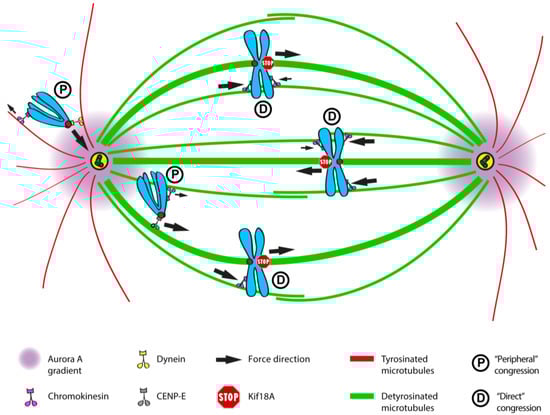 In preparation for cell division, two poles and an equator start to be defined by the mitotic spindle axis. Precisely at the onset of mitosis, when chromosomes start condensing and the nuclear envelope breaks down, dispersed chromosomes initiate directed movements that culminate with their position at the spindle equator before migrating to the poles after sister chromatid separation. This stochastic motion towards the equator coincides with the beginning of prometaphase and is known as “chromosome congression” (from the English “to come together”; terminology first introduced by Darlington [1]). Chromosome congression truly represents the first challenge of mitosis and culminates with the formation of a metaphase plate, a hallmark of mitosis in metazoans, and occurs in tight spatiotemporal coordination with the assembly of the mitotic spindle that mediates the microtubule-chromosome interactions required for chromosome movement.