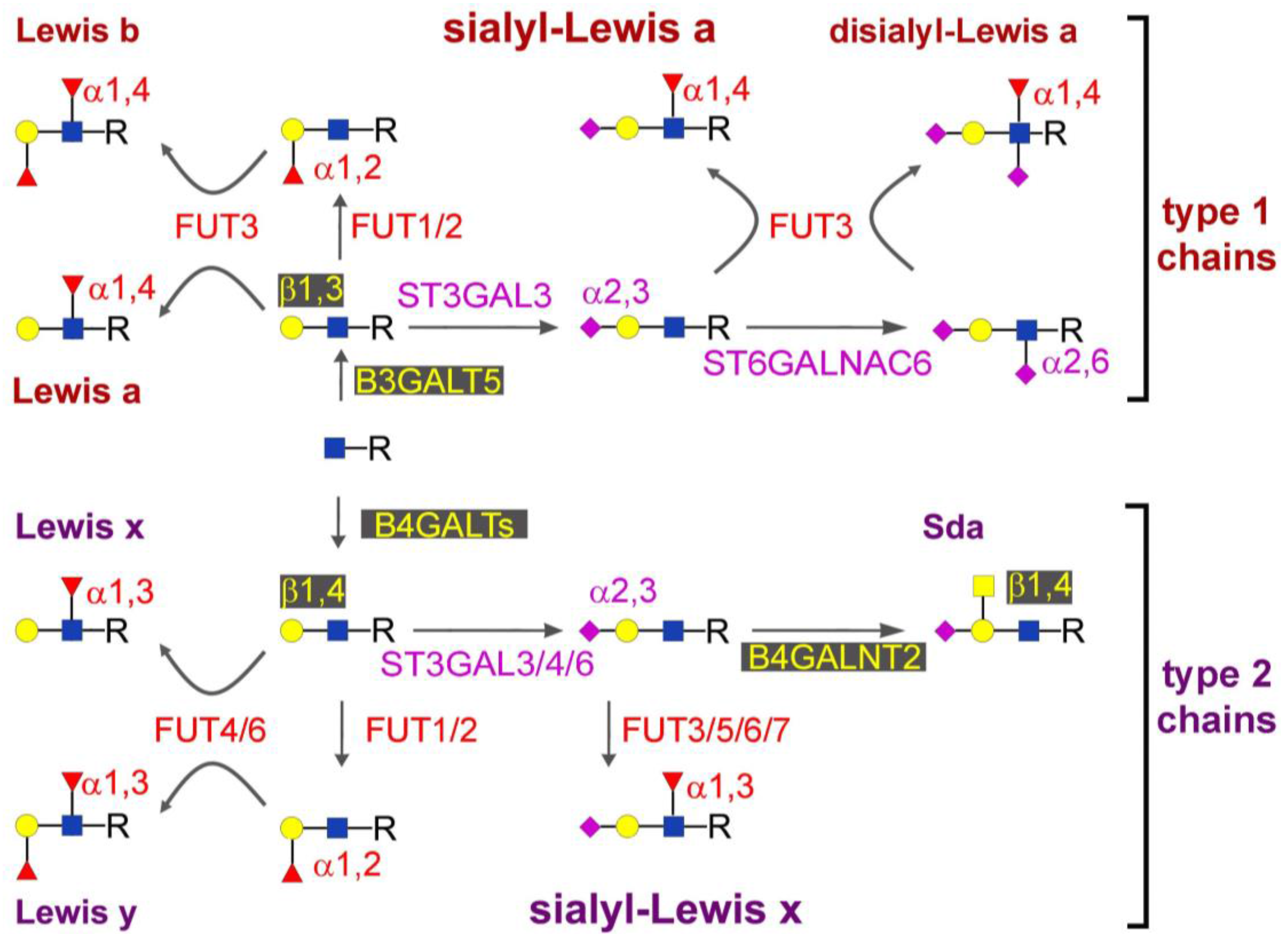 Structure and biosynthesis of Lewis antigens. Monosaccharides are depicted. Blue square: N-acetylglucosamine (GlcNAc); yellow square: N-acetylgalactosamine (GalNAc); yellow circle: galactose (Gal); red triangle: fucose (Fuc); pink diamond: sialic acid (Sia). Anomers, linkage positions, and enzymes involved in the reactions are indicated. All enzymes known to be able to perform a reaction are listed, note that only some of them are proven to be expressed in gastrointestinal tissues, as detailed in the text.