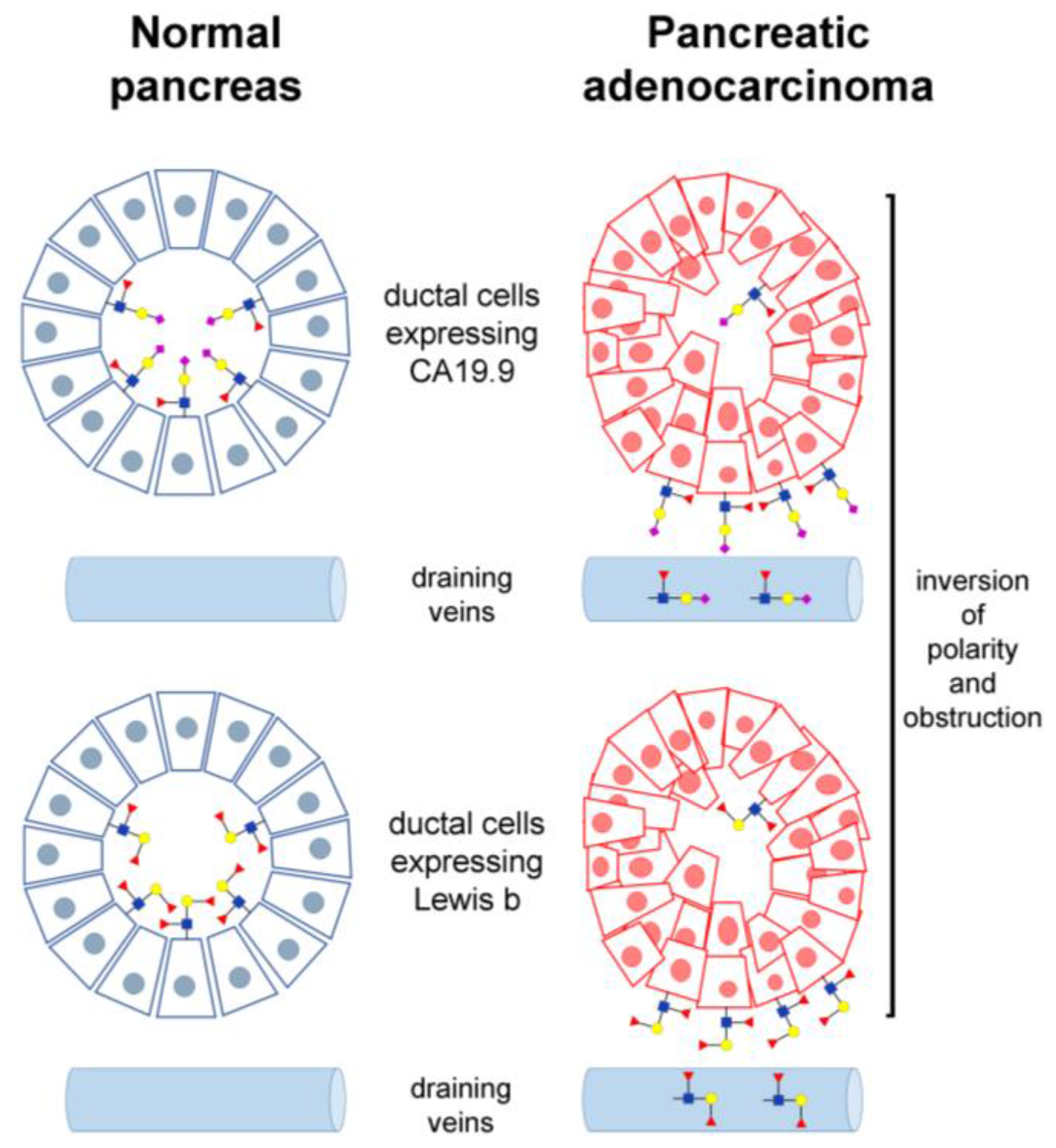 Proposed model of the elevation of circulating CA19.9 in pancreatic cancer patients. The inversion of polarity occurring in malignant ductal cells [125] together with the obstruction of the cancerous ducts determine reabsorption by the blood of the molecules normally secreted by the organ [121,124]. According to recent data [40], the expression of type 1 chain Lewis antigens in the pancreas is regulated by the individual glycosyltransferase pattern, which is not deregulated in cancer. Consequently, serum CA19.9 levels increase only in those patients actually expressing the antigen in their normal ducts. Non-malignant pancreatic diseases causing obstruction, such as chronic pancreatitis, are expected to determine partially overlapping elevation of circulating antigens. Sugars are depicted as in Figure 1.