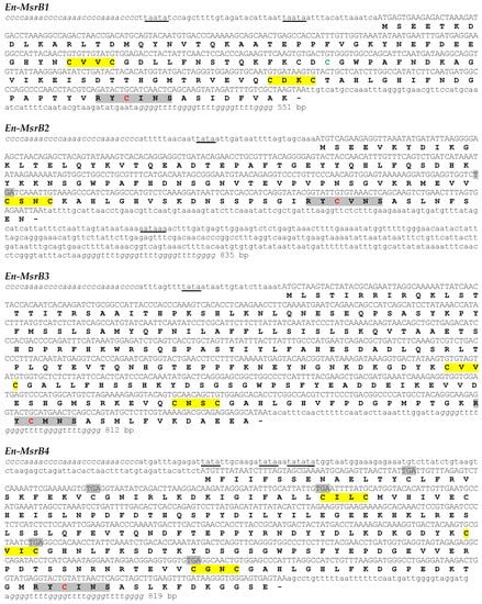 Nucleotide sequences of the En-MsrB genes and deduced amino acid sequences. In the nucleotide sequences, the telomeric repeats are in italics, the 5’ leader and 3’ trailer regions in lower case letters and the open reading frame in capital letters. The putative transcriptional regulation and polyadenylation signals are underlined, and the in-frame TGA codons highlighted in grey. In the amino acid sequences, the CXXC motifs and the catalytic sites are highlighted in yellow and grey, respectively, and the catalytic and the resolving cysteines are highlighted in red and green, respectively.