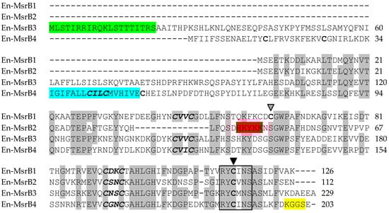 The proteins (En-MsrB1 to En-MsrB4) encoded by the four En-MsrB genes markedly vary from one another in chain length (112 amino acid residues in En-MsrB2, 229 in En-MsrB3) and degree of sequence similarity (42.6% identity in 122 residue-overlaps between En-MsrB2 and En-MsrB3, 56.8% identity in 139 residue-overlaps between En-MsrB3 and En-MsrB4) (Figure 2). However, in spite of these variations, they all uniformly show the MsrB-specific ‘catalytic Cys’ lying within a highly conserved Arg-Tyr-Cys-Met/Val/Ile-Asn-Ser-Ala-Ser sequence segment of the carboxyl-terminal region.