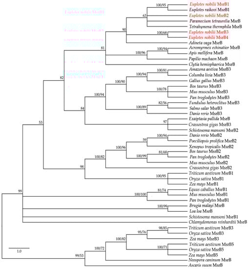 The application of the BI and ML methods to a selected panel of eukaryotic MsrB amino acid sequences available from the GenBank database (MsrBs’ accession numbers can be found in Appendix, Table A1) generated closely similar trees (Figure 3), in which the four En-MsrBs group together into a statistically well supported clade including MsrB sequences of other ciliates and a MsrB sequence described as of non-metazoan origin from the bdelloid rotifer, Adineta vaga [28]. Within this clade, En-MsrB1 finds its counterpart with a MsrB sequence from E. raikovi, while En-MsrB2 associates with MsrBs from Paramecium and Tetrahymena, and En-MsrB4 and En-MsrB4 form their own branch.