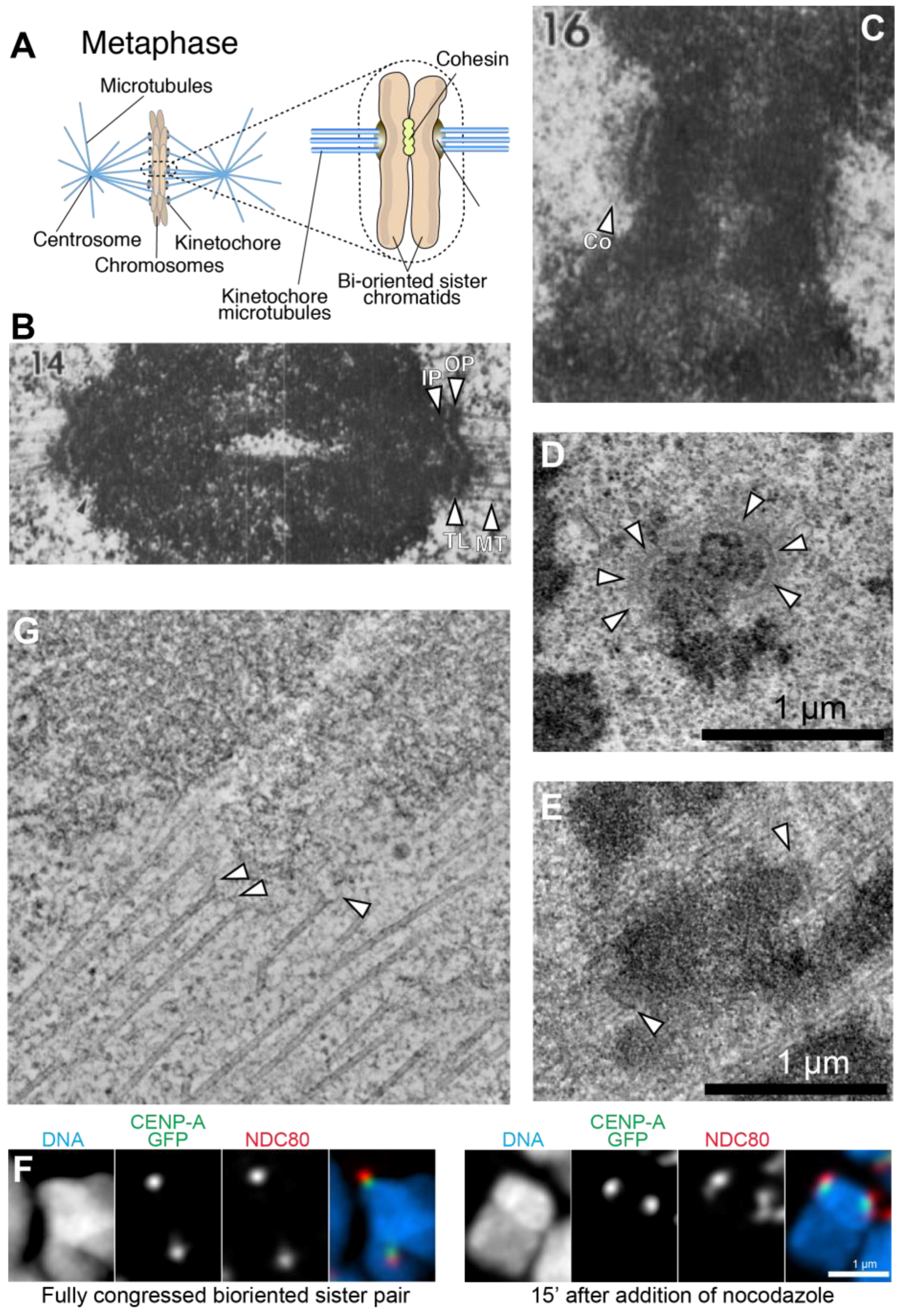 Kinetochore morphology in vertebrate cells (A) Schematic showing the attachment of chromosomes to spindle microtubules through kinetochores; (B) Early work on the kinetochore identified inner and outer plates, separated by a translucent layer. Microtubules terminate end-on on the kinetochore outer plate. Arrowheads indicate inner plate (IP), outer plate (OP), translucent layer (TL), and kinetochore microtubules (MT). Image reproduced with permission from reference [7]; (C) The corona (Co) is a fibrous structure that is more clearly visible on kinetochores prior to microtubule attachment. Image reproduced with permission from reference [7]; (D,E) Prior to microtubule attachment (D), vertebrate kinetochores adopt a crescent-like shape. The latter is not visible on fully congressed and bi-oriented kinetochores. Images courtesy of Alexey Khodjakov. See also reference [8]; (F) Left: at metaphase, the distributions of two proteins in the inner and outer kinetochores (NDC80 and CENP-A respectively), are similar; Right: After treatment with a microtubule-depolymerizing drug (nocodazole), proteins in the corona (not shown) and in the outer kinetochore undergo an expansion and form the crescent-like shape already shown in D. Image courtesy of Alexey Khodjakov. See also reference [8]; (G) A prometaphase PtK2 cell prepared for electron microscopy by high-pressure freezing and freeze-substitution in glutaraldehyde and Osmium tetroxide. The cell was then embedded in plastic, serial-sectioned with 300 nm sections, and imaged by serial tilting. A 3D reconstruction was computed by back-projection, using the IMOD software package. The slice shown here is about 5 nm thick, and represents the average of two consecutive tomographic planes. Arrowheads indicate slender fibrils connecting the end of microtubules to the kinetochore. Image courtesy of J. Richard McIntosh.