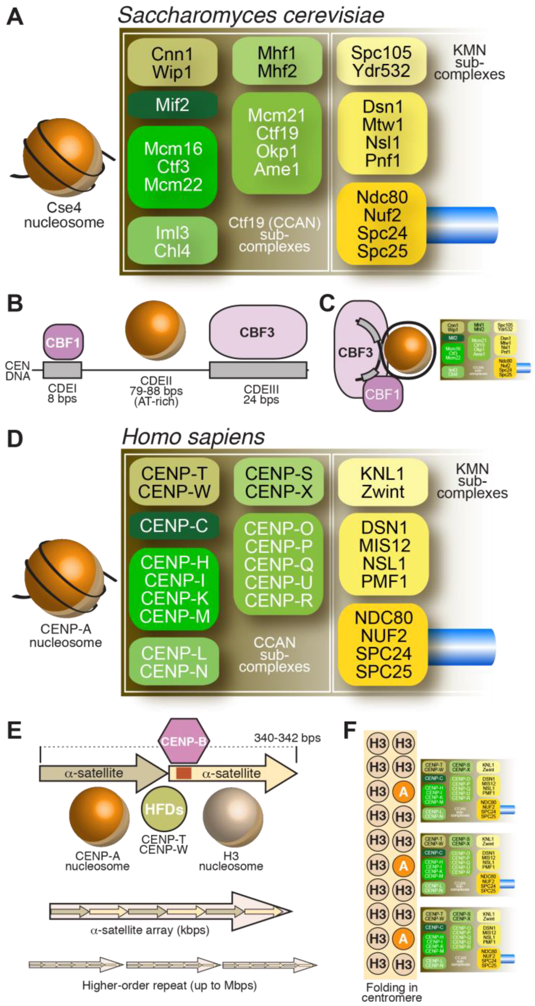 Schematic summary of the structural organization of budding yeast and human kinetochores. Related colors highlight conserved components/complexes. (A) Schematic of the S. cerevisiae kinetochore with subunit names; (B) The S. cerevisiae centromere (CEN) DNA is stereotyped and contains CDEI, CDEII, and CDEIII regions, which bind CBF1, Cse4CENP-A, and CBF3, respectively; (C) Folding of CEN DNA around a Cse4 nucleosome brings CBF1 and CBF3 in close proximity; (D) Schematic of the H. sapiens kinetochore. Orthologous complexes are shown in the same order as in (A); (E) The unit of human centromere assembly may consist of a pair of α-satellite repeats, each precisely wrapping around a nucleosome. One of the two α-satellite repeats carries a CENP-B box. The CENP-TW complex may interact in the inter-nucleosomal region through its histone-fold domain (HFDs) [77,78]. Repeats of this unit give rise to α-satellite arrays, which in turn may organize themselves in higher order repeats (HORs); (F) The human centromere arises from folding of centromeric chromatin in three dimensions to facilitate the participation of several CENP-A nucleosomes in kinetochore assembly.