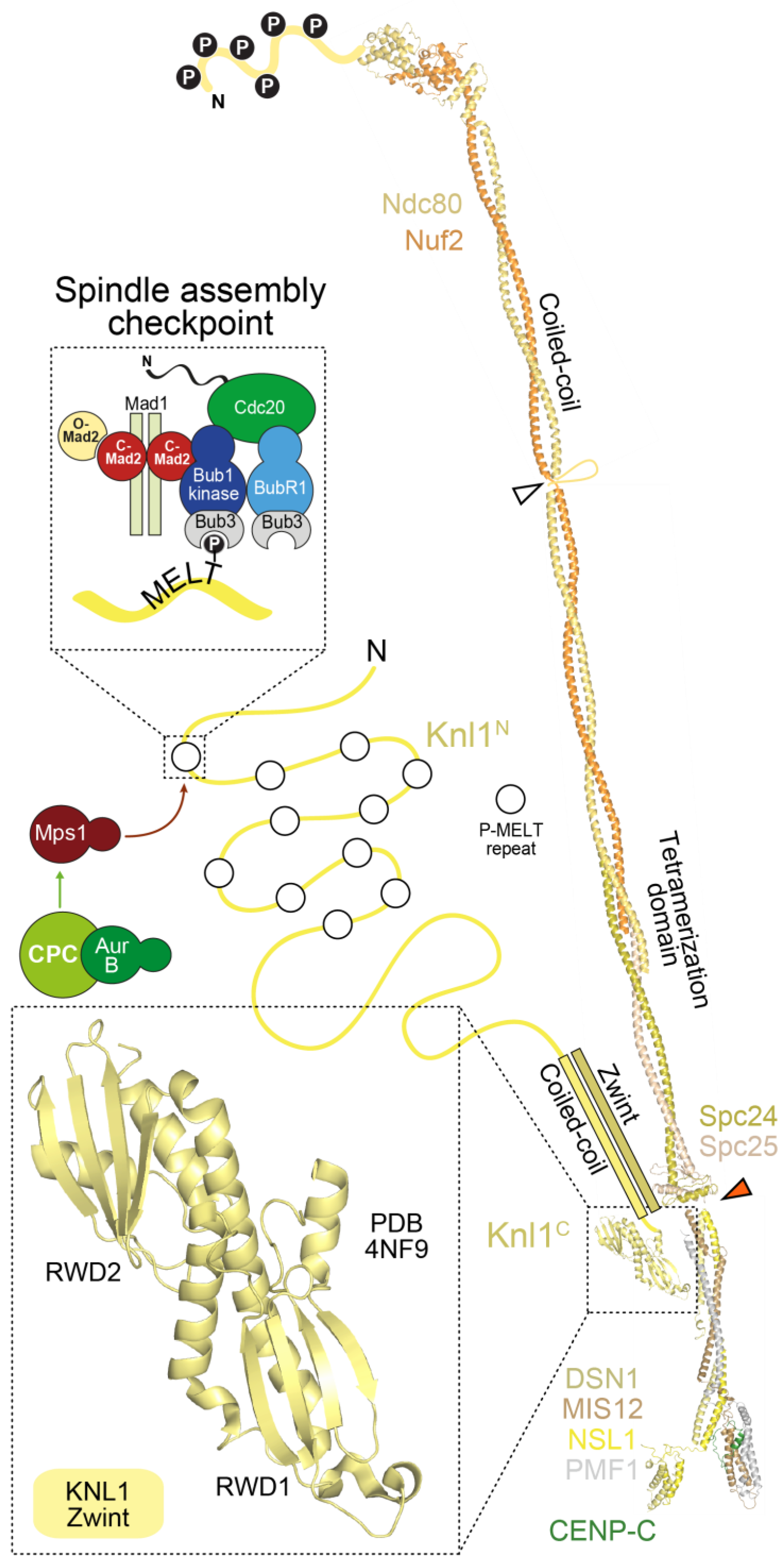 Orchestration of the spindle assembly checkpoint (SAC) by the KMN network SAC components are recruited via the Knl1 subunit that is 2316 residues in humans and is largely disordered. Exceptions are a predicted coiled-coil around residues 1850–2100, and the C-terminal tandem RWD domains, whose crystal structure is shown [235]. The RWD region of Knl1 binds directly to the MIS12 complex [234,235]. The N-terminal half of Knl1 contains multiple MELT repeats (Met-Glu-Leu-Thr) that are targeted by Mps1 kinase (which in turn requires Aurora B kinase to become activated). Each MELT repeat has the potential to assemble active SAC complexes that signal lack of microtubule attachment and arrest the cell cycle in mitosis.