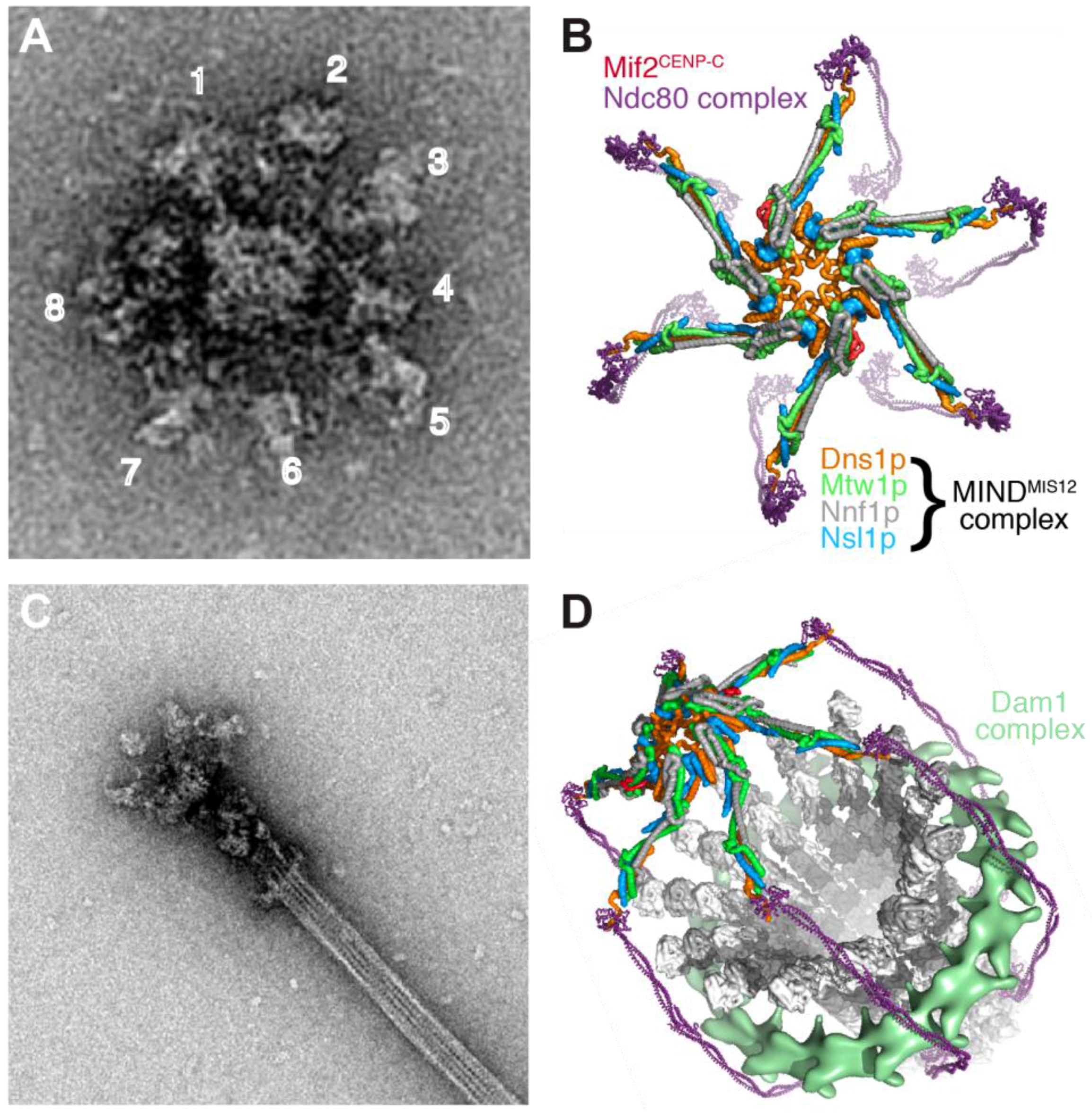 Images and structural model of budding yeast kinetochore particles. (A) Negative stain electron micrographs showing a kinetochore particle isolated from S. cerevisiae [291]. Images in this panel and in C courtesy of Sue Biggins and Tamir Gonen; (B) A rendered image with possible molecular interpretation of the negatively stained particles showing MINDMIS12:CENP-C complexes departing from a central “hub” and connecting with Ndc80 complexes. Image reproduced with permission from reference [240]; (C) Negative stain electron micrographs showing a S. cerevisiae kinetochore particle bound to the end of a taxol-stabilized microtubule [291]. Image courtesy of Sue Biggins and Tamir Gonen; (D) The structure in (B) is shown to surround the microtubule in end-on configuration. The Dam1 complex stabilizes the arrangement by surrounding the microtubule. Image reproduced with permission from reference [240].