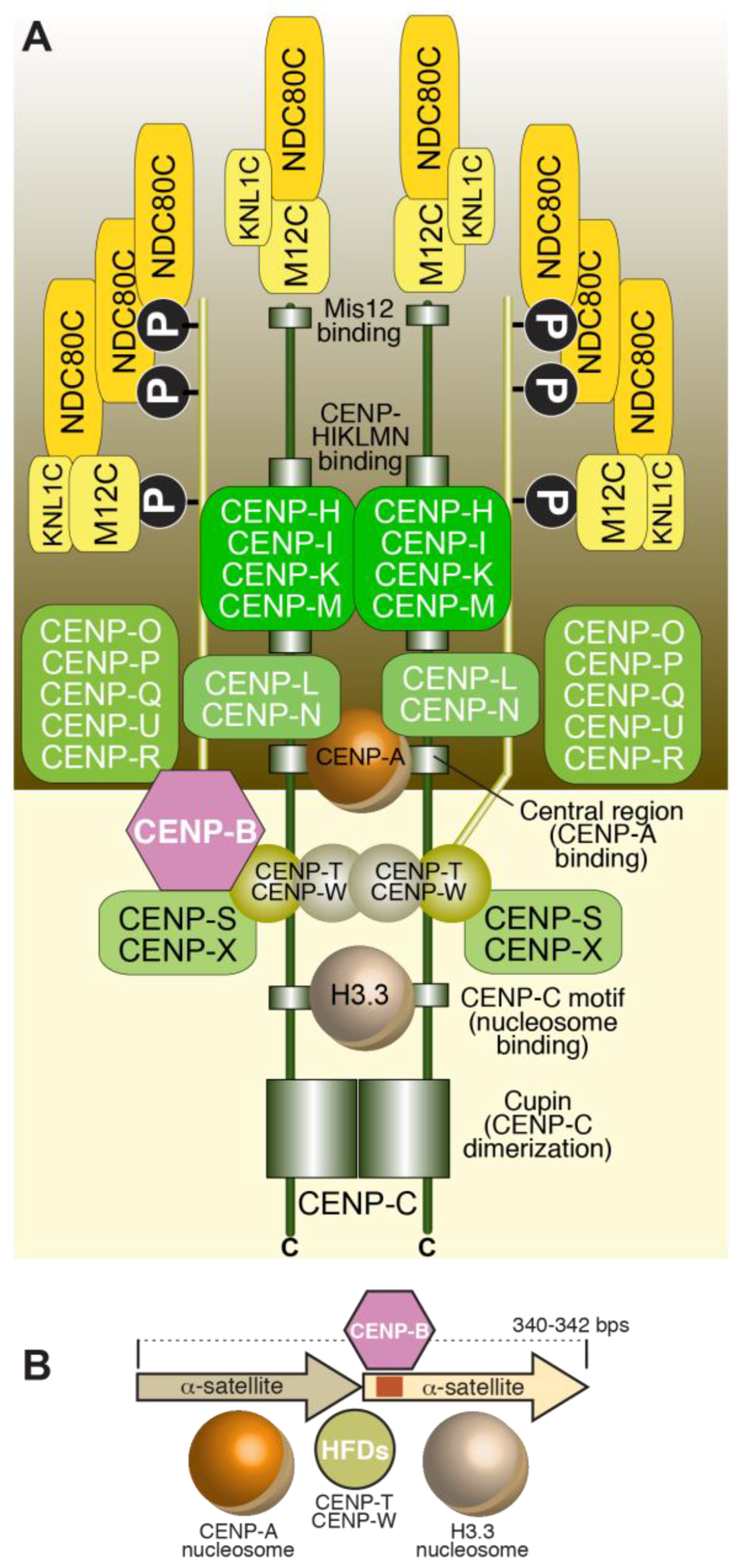 This section illustrates the important concept that inner kinetochores are built by evolutionary conserved interactions of CCAN subunits with the CENP-A nucleosome. In line with the theory that centromere identity is determined epigenetically in most organisms (the notable exception being budding yeasts, where a specific sequence is recognized by the CBF3 complex to direct CENP-A loading), none of these interactions, appears to require specific DNA sequences, except for those made by CENP-B, which is not conserved even throughout vertebrates and is not essential but may contribute to kinetochore stability when present. The evolutionary presence/absence and phenotypic effect of CCAN subunit inhibitions, with the possible exception of CENP-C, are also surprisingly variable, with kinetochores of well-studied models such as C. elegans and D. melanogaster lacking the entire repertoire except for CENP-C [62,88,89,133]. These greatly simplified kinetochores appear to entirely rely on CENP-C being a linker between the CENP-A nucleosome and the outer kinetochore, as discussed in Section 5. This variation raises intriguing questions about the functional roles of this large group of inner kinetochore proteins that will be important to address in future studies.