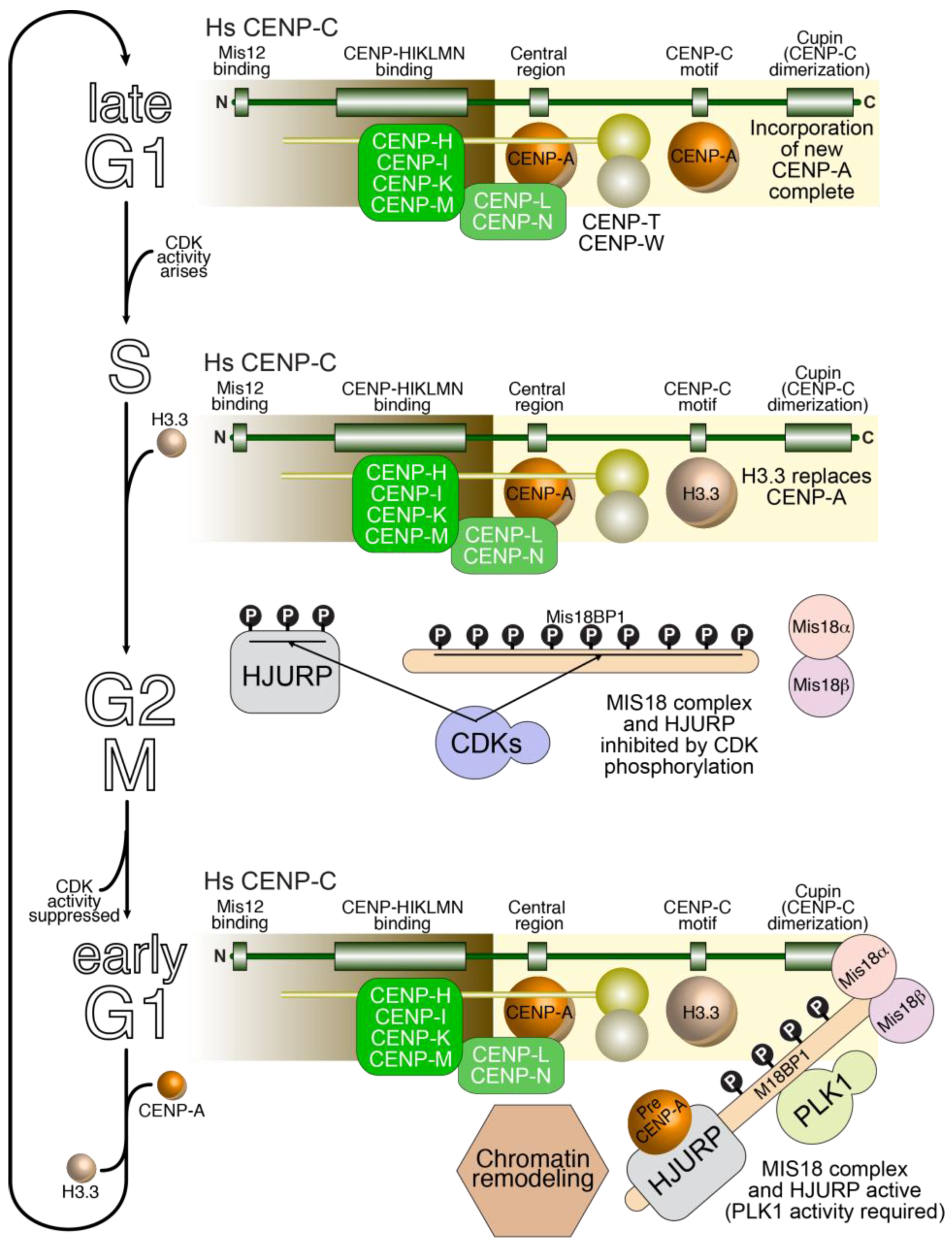 Cell cycle-regulated replenishment of CENP-A nucleosomes New. CENP-A incorporation takes place after mitotic exit, early in G1 phase (bottom). It is driven by an existing, active CENP-A nucleosome (e.g., because bound to CCAN subunits), and directed on a neighboring nucleosome. Here, we hypothesize that the neighboring nucleosome in humans is already bound to the CENP-C motif of CENP-C. An active MIS18 complex, including M18BP1, recruits HJURP, which binds to pre-nucleosomal CENP-A. The C-terminal region of CENP-C has been implicated in this reaction, which also requires PLK1 activity. A chromatin-remodeling factor and other chromatin-associated factors promote extraction of H3.3 and its replacement with CENP-A through an ATP-dependent reaction. The resulting configuration (top) persists until DNA replication (S-phase), when CENP-A “vacancies” caused by distribution of CENP-A to the sister chromatids during DNA replication, are filled with H3.3. This configuration then persists through the rest of the cell cycle until mitotic exit, because the CENP-A loading machinery is inhibited by CDK activity (middle).