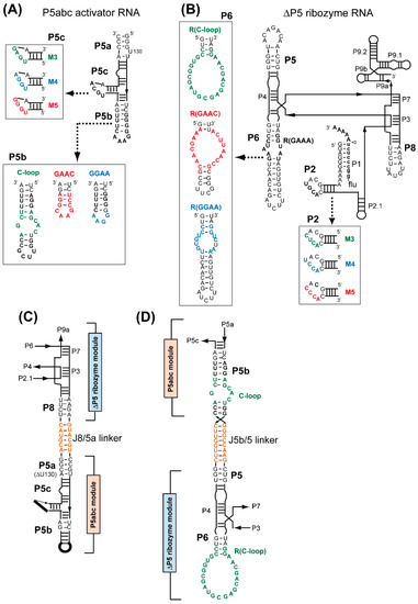 - Naito, Y.; Shiraishi, H.; Inoue, T. P5abc of the Tetrahymena ribozyme consists of three functionally independent elements. RNA 1998, 4, 837–846. [Google Scholar] [CrossRef] [PubMed]