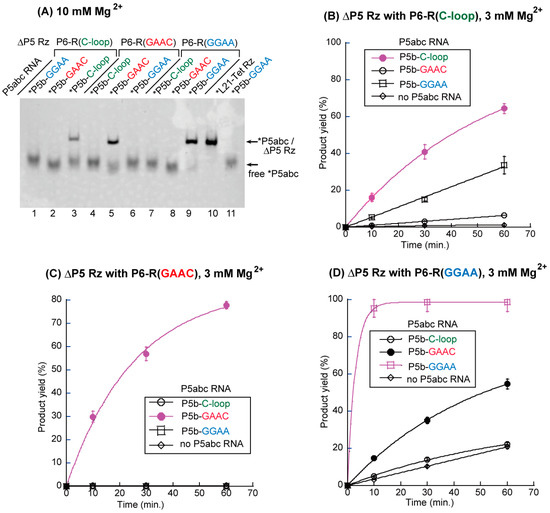 To determine whether the P5abc/ΔP5 complexes supported by artificial motifs were catalytically active, their abilities to promote substrate-cleavage reactions were examined. A 1.5-fold excess molar amount of P5abc RNA (0.75 μM) was added to activate the ΔP5 core ribozyme in the presence of equimolar amounts of the substrate RNA (0.5 μM) and the ΔP5 RNA (0.5 μM). In the presence of 3 mM Mg2+, three biomolecular ribozymes possessing matched P5b–P6 interactions exhibited higher catalytic activity than the remaining six pairs possessing mismatched P5b–P6 interactions (Supplementary Materials Table S1). On the other hand, the activity of the ribozyme with the matched C-loop/R(C-loop) pair (kobs = 0.02 min−1, Figure 2B) was the same as that with a mismatched GAAC/R(GGAA) pair (kobs = 0.02 min−1, Figure 2D). The comparison of nine bimolecular ribozymes indicated that a ΔP5 RNA variant with an R(GAAC) motif showed the highest specificity to its cognate partner P5abc with a GAAC loop (kobs = 0.04 min−1), since the remaining two P5abc RNAs could not activate the core ribozyme (Figure 2C). A ΔP5 RNA variant with an R(GGAA) motif exhibited the highest catalytic activity in the presence of its cognate partner (kobs = 0.34 min−1), among the three matched complexes. On the other hand, the P6-R(GGAA) variant was also moderately activated by a mismatched P5abc with a GAAC loop (Figure 2D). This was consistent with the results of EMSA in the presence of 15 mM Mg2+, in which the mismatched GAAC/R(GGAA) pair weakly supported the P5abc/ΔP5 complex (Supplementary Materials Figure S1A). The C-loop/R(C-loop) pair was the least active pair among the three matched pairs in terms of both the binding specificity of P5abc and ΔP5 RNA and the catalytic activity of the matched P5abc/ΔP5 complex.