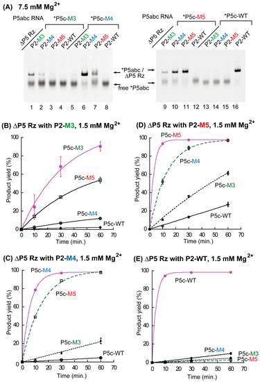We then investigated whether the binding affinity and the specificity of base pairs, which were predicted in Supplementary Materials Figure S2 and examined by EMSA (Figure 3A), correlated with the catalytic activity of P5abc/ΔP5 bimolecular ribozymes. In the presence of 1.5 mM Mg2+, each of the four ΔP5 RNAs exhibited its highest activity with its cognate partner P5abc (Table S2). The parent WT bimolecular ribozyme (kobs = 0.32 min−1) and its M5 variant (kobs = 0.31 min−1) showed closely similar activity, and were 2-fold more active than the M4 variant (kobs = 0.16 min−1). The M3 variant (kobs = 0.03 min−1) was distinctly less active than the three complexes. The rate constant of the M3 variant (0.03 min−1) was even smaller than those of two mismatched complexes having the P5c-M5/P2-M4 mismatched pair (Figure 2C, kobs = 0.069 min−1) and the P5c-M4/P2-M5 pair (Figure 2D, kobs = 0.076 min−1). These observations are qualitatively consistent with those from structure prediction and EMSA.