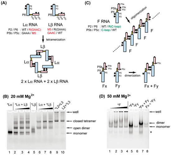 Oligomeric RNA nanostructures whose assembly was mediated by the association between the P5abc module and the ΔP5 module. (A) Selective formation of closed tetramers by Lα RNA and Lβ RNA. (B) EMSA of Lα RNA + Lβ RNA in the presence of 20 mM Mg2+. The asterisks indicate monomer RNAs labeled with the BODIPY fluorophore. In lanes 1 and 5, the concentrations of Lα and Lβ were 0.5 μM. The concentrations of Lα + Lβ were 0.5 + 0.5 μM in lanes 2 and 6, 1.0 + 1.0 μM in lanes 3 and 7, and 2.0 + 2.0 μM in lanes 4 and 8. The concentrations of L2 + L3 were 0.5 + 0.5 μM in lanes 9 and 10. (C) One-dimensional open oligomers of F RNA and selective dimerization of its mutants. (D) EMSA of F RNA and its mutants in the presence of 50 mM Mg2+. The asterisks indicate monomer RNAs labeled with the BODIPY fluorophore. The concentrations of F RNA were 0.25 μM, 0.5 μM, 1.0 μM, and 2.0 μM in lanes 1, 2, 3, and 4, respectively. The concentrations of Fx RNA and Fy RNA were 0.5 μM in lanes 5 and 6. The concentrations of Fx RNA + Fy RNA were 0.5 + 0.5 μM in lanes 7 and 8.