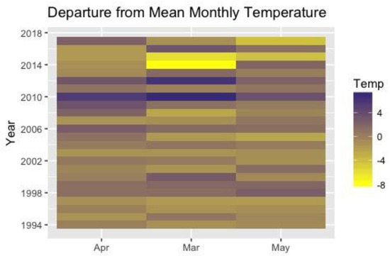 Heat map of departure from mean of spring-time monthly temperatures over the course of the study. Temperature is given in °F.