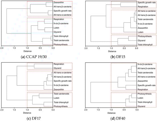 Cluster dendrograms of all-trans β-carotene, 9-cis β-carotene, glycerol, lutein, zeaxanthin, all-trans α-carotene, photosynthesis, respiration, total carotenoids, and total chlorophyll for all five Dunaliella strains cultivated at four light intensities. (a) CCAP 19/30; (b) DF15; (c) DF17; (d) DF40 and (e) UTEX 2538.