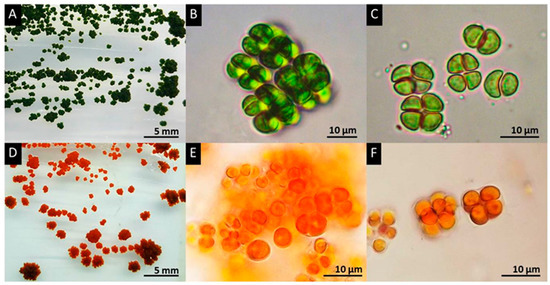 Morphologies of green and red cells of Chlorosarcinopsis PY02. (A) Green colonies on solid medium; (B,E) sarcinoid features formed by non-segregated vegetative cell division is seen in both green (B) and red cells (E); (C) the tetrad green cell stage; (D) Orange-red pigment accumulation resulting from secondary carotenoid accumulation appeared in red colonies on solid medium; (E) sarcinoid form in red cells; (F) tetrad red cells. PY02 was cultivated on TAP agar. (A–C) were taken on day 10. (D–F) were taken on day 35.