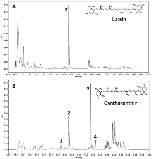 UPLC chromatograms of Chlorosarcinopsis PY02 extracts from green (A) and red (B) cells. Peak 1 = adonixanthin, peak 2 = lutein, peak 3 = canthaxanthin and peak 4 = 3-OH-echinenone.