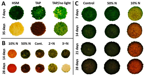 Algal trophic tests on solid medium; autotrophic, mixotrophic and heterotrophic growth, were tested on HSM with light, TAP with light, and TAP with no light, respectively. The nitrogen concentration effect on algal growth was investigated by increasing nitrogen concentration (in the form of NH4+) 2-fold from 7.48 mM (replete TAP medium) to 14.96 mM (2×) and 3-fold to 22.4 mM (3×), and decreasing it 2-fold to 3.74 mM (50% N) and 10-fold to 0.748 mM (10% N) under continuous white light of 60 µmol·m−2·s−1 at 25 °C.