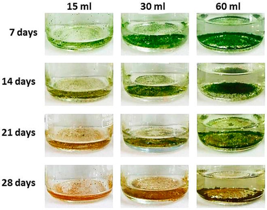 Effect of media volume on Chlorosarcinopsis PY02 growth and cell colour. This experiment was conducted using 50% N TAP liquid medium with initial volumes of 15, 30 and 60 mL in 250 mL Schott Duran bottles.