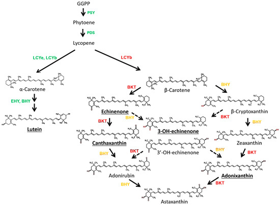 Ketocarotenoids, such as astaxanthin and canthaxanthin are commercially important carotenoids. These pigments have applications in the nutraceutical, pharmaceutical and cosmetic industries, and are also used in the aquaculture and poultry industries [1,2,3]. Ketocarotenoids not only exhibit powerful antioxidative properties [1], but also help to protect against a wide range of human diseases including UV light-induced tumours [2,3], benign prostatic hyperplasia, prostate and liver tumours [4,5,6], atherosclerosis, and cardiovascular disease [7]. They also strengthen the body’s immune system [8,9,10], and have anti-ageing [11] and anti-inflammatory properties [10,12]. In animal feed, ketocarotenoids (commonly canthaxanthin, phoenicoxanthin and astaxanthin) are added as feed supplements for colouring and health benefits. They enhance the yolk colour in laying hens through their ability to be digested and accumulated in the yolk [13]. Additionally, astaxanthin and canthaxanthin have been shown to improve the growth of farmed fish and shrimp [14,15]. In nature, however, there are only a few organisms that have the ability to synthesize and accumulate ketocarotenoids; principally certain bacteria [16], yeast [17] and algae [18].