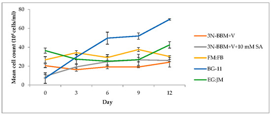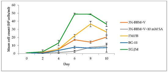 Effect of a range of media on the growth of H. pluvialis in the green stage. Mean cell count data ± S.D. (n = 3). The green stage involved culturing at 20 °C, 40 µmol photons m−2·s−1, 12:12 photoperiod, 150 rpm over a 10-day period.