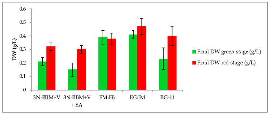 Dry weight (DW) yields of green and red stage (H. pluvialis cultured in a range of media under autotropic and mixotrophic conditions). Mean DW (g·L−1) ± S.D. (n = 3). Green stage involved culturing at 20 °C, 40 µmol photons m−2·s−1, 12:12 photoperiod, 150 rpm over a 10-day period. Red stage involved culturing at 20 °C, continuous light at 240 µmol photons m−2·s−1 over a 12-day period.