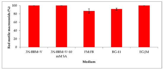 Percentage of red motile H. pluvialis macrozooids produced in the red stage after cultivation of H. pluvialis in a range of media. Mean % red motile macrozooids on day 12 ± S.D. (n = 3). Green stage involved culturing at 20 °C, 40 µmol photons m−2·s−1, 12:12 photoperiod, 150 rpm for 10 days. Red stage involved culturing at 20 °C, continuous light at 240 µmol photons m−2·s−1 for 12 days.