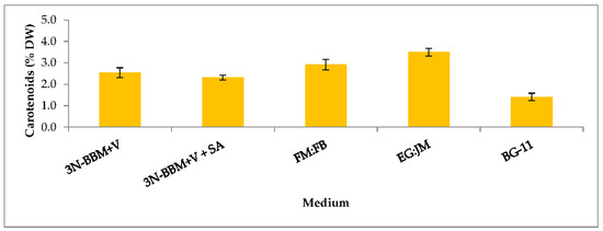 Carotenoid content (% DW) in H. pluvialis cultivated in a range of autotropic and mixotrophic media. Mean carotenoid content (% DW) ± S.D. (n = 3). Re-suspension of cultures in green stage grown in various autotrophic and mixotrophic media (10 days) in red stage induction conditions for 12 days in medium without nitrate (20 °C, continuous light at 240 µmol photons m−2·s−1).