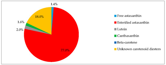 EG:JM was determined to be the optimal medium for the green stage. The highest cell count and DW was obtained with cells cultured in EG:JM, then re-suspended in the medium without nitrate, with a biomass yield of 0.47 g·L−1 (Figure 5) with the highest carotenoid content of 3.50% DW (Figure 7). The astaxanthin content was 2.74% ± 0.11% DW and amounted to 78.4% of total carotenoids with 77% in the esterified forms (Figure 8). The astaxanthin monoesters were esterified with oleic and linoleic acids. Diesters were present but the esterified FAs were not identified. To our knowledge, this is the highest reported astaxanthin content and composition in red motile macrozooids. It was interestingly observed that 18% of the carotenoids were unknown and these would be useful to characterise in future studies.