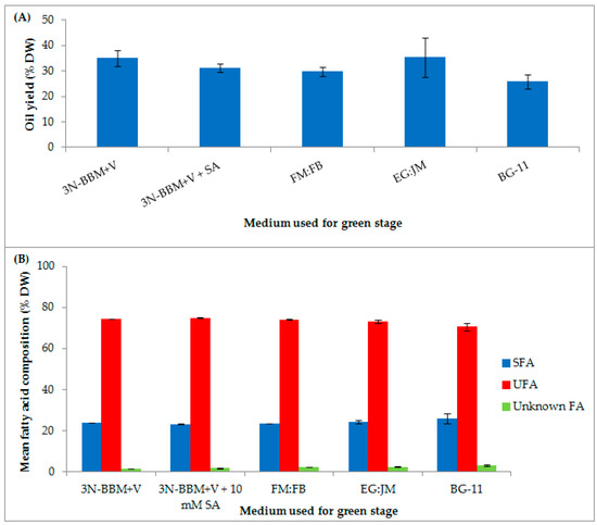 H. pluvialis cultivated in a range of media under autotropic and mixotrophic conditions (A) Mean total fatty acid content (% DW); (B) mean fatty acid composition (% DW) as saturated, unsaturated or unknown fatty acids. Mean DW (g·L−1) ± S.D. (n = 3). Cultures incubated for 10 days in the green stage in various autotrophic and mixotrophic media and 12 days in the red stage in medium without nitrate (20 °C, continuous light at 240 µmol photons m−2·s−1). SFA = Saturated fatty acid, UFA = Unsaturated fatty acid, Unknown FA = Unknown fatty acid.