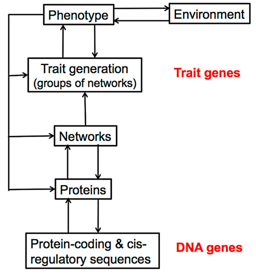 Diagram showing some of the levels of activity that link the genotype to the phenotype and to the environment, together with some possible feedbacks between them. The levels at which trait and DNA genes operate are shown in red. (From [9]).