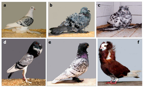 Pigeon strains. (a) ice pigeon; (b) frillback pigeon; (c) English trumpeter pigeon; (d) pigmy pouter pigeon; (e) oriental frill pigeon; (f) the capuchin red pigeon. From www.mnn.com/earth-matters/animals/stories/18-most-bizarre-pigeon-breeds (Courtesy of Jim Gifford, published under CC BY-SA 2.0).
