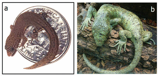 Small and large lizards. (a) Jaragua Sphaero, the dwarf gecko (from www.popsci.com/scitech/article/2002-01/small-beautiful, courtesy of S. Blair Hedges), is 16 mm long; (b) the Solomon Island skink (from en.wikipedia.org/wiki/Solomon_Islands_skink, courtesy of Dry Tim Vickers) is 830 mm long. The only obvious differences are in pigmentation and size.