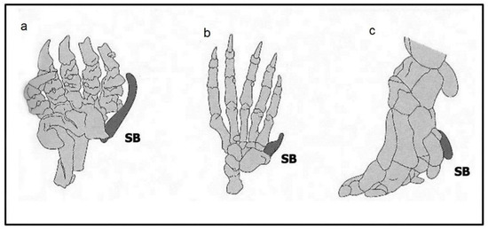 Ectopic digits. Drawings of the forelimb skeletons of (a) the mole; (b) the panda and (c) the elephant. Each ectopic digit (darkened) reflects unusual growth of a normal sesamoid bone (SB). (Courtesy of (a) Royal Society [33]; (b) Garland Press [3]; (c) Science [34]).