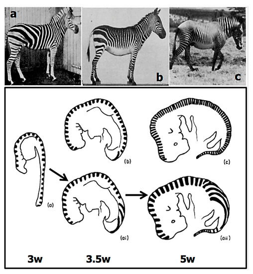 Likely initial patterning of zebra stripes. Top panel. (a) Equus quagga burchelli; (b) Equus zebra; (c) E. grevyi. Lower panel. Drawing of horse embryos aged 3, 3.5, and 5 weeks. The upper three drawings have stripes spaced at 200 µm, the lower two drawings indicate the effect of growth on the stripes that would have been laid down at 3 weeks. (From [35]).