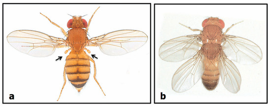 The Drosophila bithorax mutant. (a) A normal fly with two wings and two halteres (arrows); (b) The bithorax mutant which has a duplication of the second thoracic segment instead of a normal third one: it therefore has a second pair of wings and no halteres ((a) Courtesy of Nicholas Gompel ©; (b) www.researchgate.net/figure/Four-winged-fly-produced-by-combining-bithorax-and-postbithorax-mutations-Reproduced_fig1_240636076 Courtesy of Steve Carr).