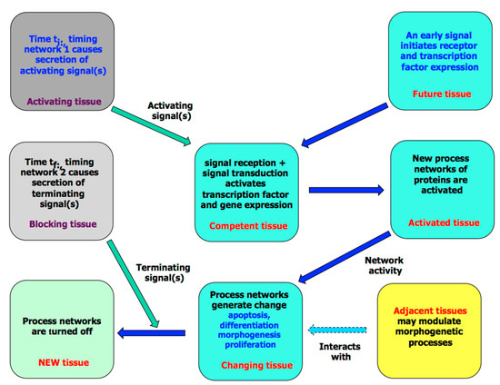 A diagram showing the various stages involved in the development of a simple tissue. Note that the events shown here assume that early signaling ensures that the activating tissue secretes one or more signals and that the future tissue is competent to receive it through expressing the appropriate receptors and transcription factors (this in turn depends on its lineage). Termination may be due to either external or autocrine signaling.
