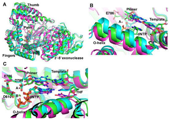 Structures of family A DNA polymerases. (A) superposition of the ternary complex crystal structures of polymerase θ [63] (green, tetrahydrofuran-ddATP; cyan, dTMP-ddATP) and the ternary complex of KlenTaq (magenta, Protein Data Bank file 1QSY, Li et al., [83]); (B) This figure shows three different conformations of O-helix. Depending upon the template, polymerase θ assumes different O-helix conformation to conduct translesion synthesis; (C) close-up of the active site in three crystal structures. Only metal B, which is Ca2+ (shown as green ball) was seen in the crystal structures of polymerase θ. Metal A (pink ball) as seen in the crystal structure of KlenTaq is also shown here. The three active site residues of KlenTaq (D610, D785 and E786) are also shown in this figure. For simplicity, the residues positions of only KlenTaq are marked.