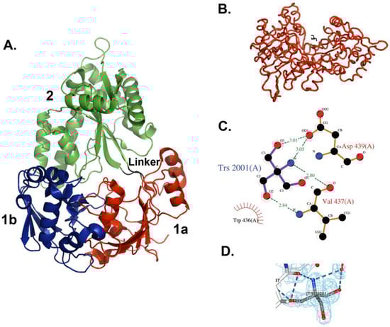 X-ray crystal structure of E. coli MppA. (A) The open form of MppA is a pear-shaped, bilobed structure. Domain 1a is shown in red, 1b is in blue, and 2 is in green. The linker region is in black. (B) The Tris binding site. Contacts are made between a bound Tris molecule (black bonds) with amino acid residues in one copy of MppA (red, molecule A) in the asymmetric unit. (A,B were made using PyMol [43]). (C) The Tris buffer molecule interacts with the side chain of Asp439 and the backbone of Val437, near the sidechain of Trp436. (C was made with LigPlot within Procheck). (D) 2fo-fc Electron density map around bound Tris molecule contoured at 1.0 (made with NGL viewer [46,47]).