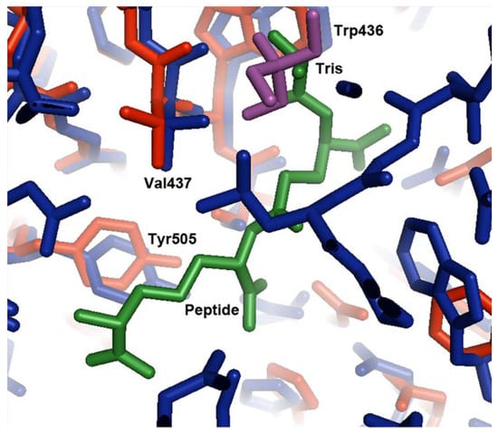 In the new crystal structure, no peptide was found bound to the protein, but subunit A has a molecule of Tris buffer bound on the surface, whereas molecule B does not. The Tris molecule makes direct hydrogen bonds with two amino acid residues in domain 2, Val437, and Asp439 (Figure 1).