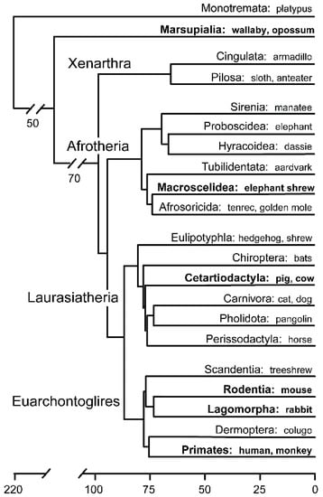 Before delving into mechanistic aspects, a brief description of mammalian taxonomy, early embryogenesis and the bewildering nomenclature (Table 1) is warranted. Class Mammalia consists of eutherian (placental) mammals, monotherian (marsupial) mammals and their sister group, the egg-laying monotremes. Within the evolutionary successful eutherians there are 19 extant orders, divided into four superordinal groups, and then four subgroups: Euarchontoglires (e.g., primates, rodents, rabbits), Laurasiatheria (e.g., carnivores, ruminants, pigs, horses, bats, whales), Afrotheria (e.g., elephants, sea cows, tenrecs) and Xenarthra (e.g., armadillos, anteaters)—all of which last shared a common ancestor about 100 million years ago (Figure 1) [2]. Before the molecular era, the embryology of representatives of numerous of these orders were examined [3], however during the last 40 years, investigations increasingly focused on only a couple of species, most prominently the easily kept laboratory animals (mouse, rat, rabbit), with some additional work done on farm animals.