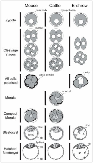 Main developmental stages in an Euarchontoglirian (mouse), Laurasiatherian (cattle) and Afrotherian (elephant shrew). While the sequence of morphological events is largely conserved, some species lack certain stages: mouse embryos compact already at the 8-cell (cleavage) stage, thus skipping the un-compacted morula stage; cattle embryos do not pass through a stage where all blastomeres are polarised and elephant shrews miss out on morula stages altogether and lose their zona pellucida prematurely, immediately after the 1-cell stage. The cattle sequence also applies to the Euarchontoglirian rabbit and human embryo. HB; hypoblast; ICM, inner cell mass; TB, trophoblast.