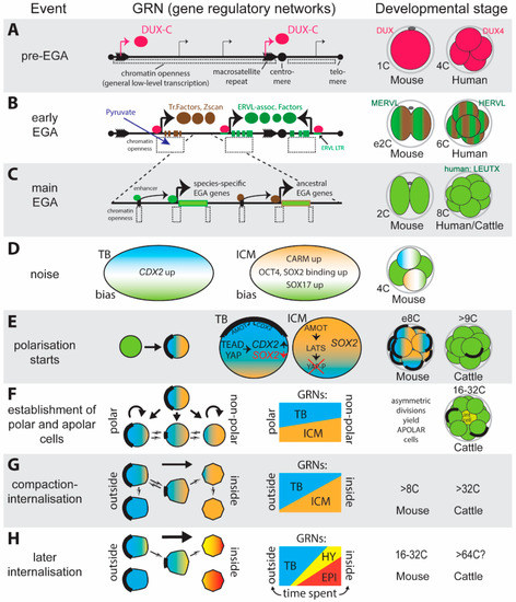 Yet at some point post-EGA, totipotency begins to be eroded as master lineage regulators compete with each other to eventually establish lineage specific gene regulatory networks (GRN) that stably restrict the fate of subpopulations of embryonic cells. Using a variety of transplantation, cell-mixing and embryo-chimera experiments, it has been shown that the fate of individual cells gradually becomes specified and then stably set (“committed”) along fixed developmental trajectories, at species-specific times (reviewed previously [32]). An exciting question, dealt with in the next section, is how this specification and commitment is achieved, and how well these processes are conserved across different mammalian orders.